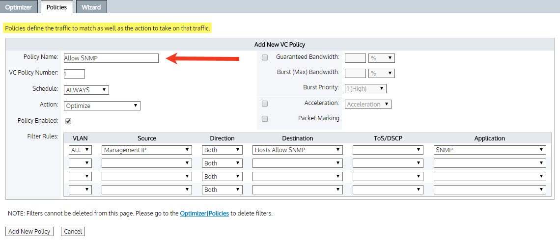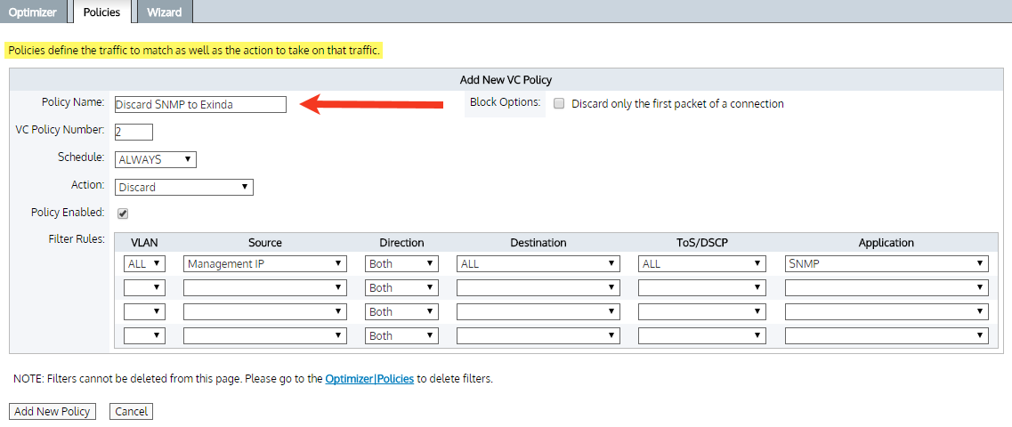 The image below shows how to create a policy to allow SNMP access to Exinda from a certain host.
