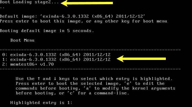And to do this, interrupt the booting process after stage 2 starts, "Boot Loading stage2...", by pressing the down arrow key twice.